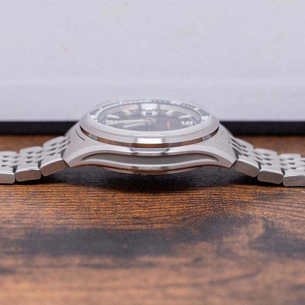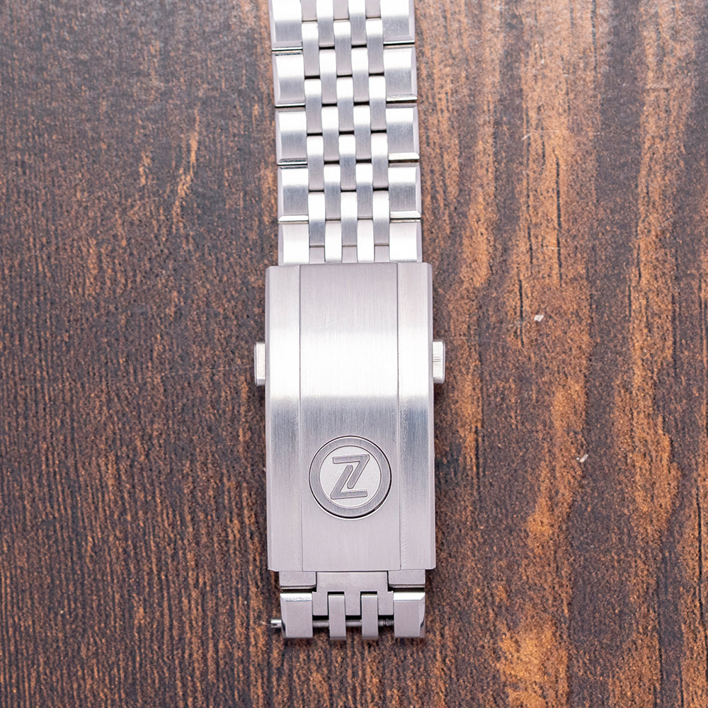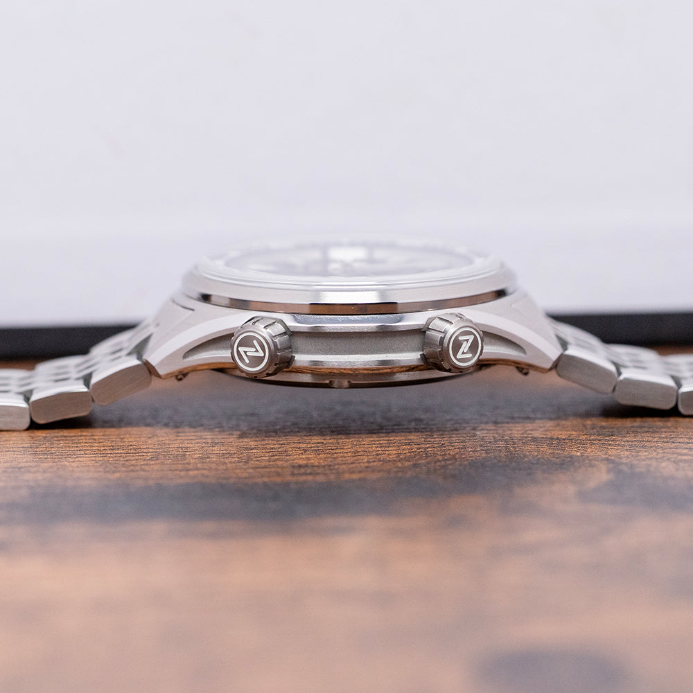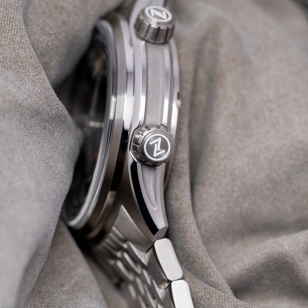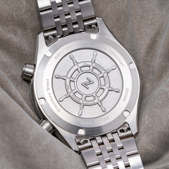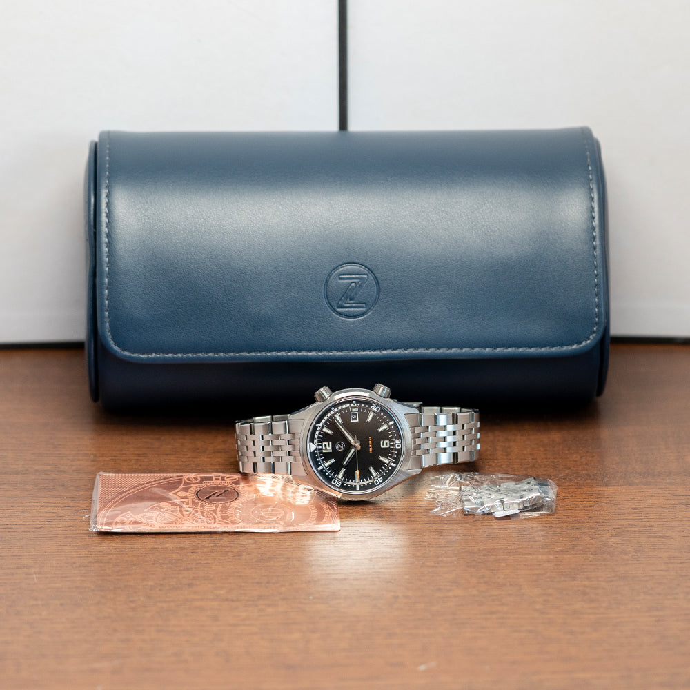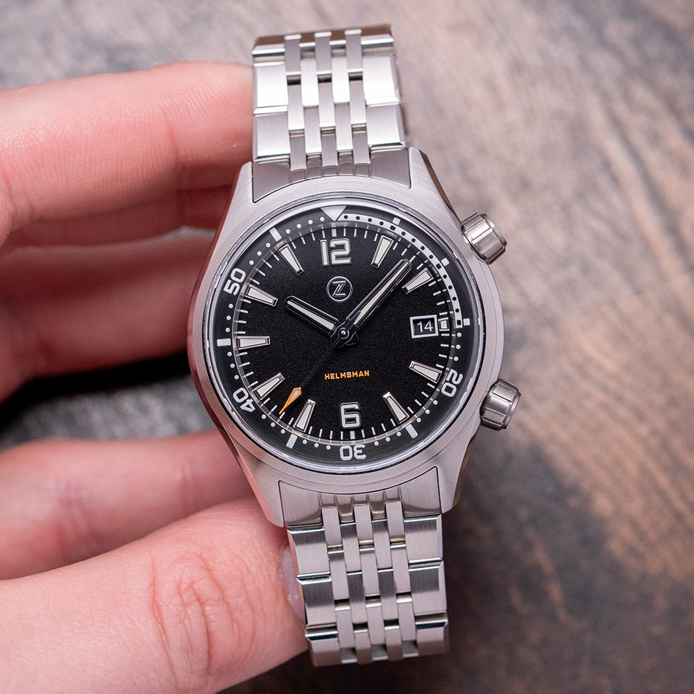 Here we have a 2025 Zelos Helmsman SS 'Midnight' Auto Limited to 500 pieces. Based on the twin-crowned and internal bezel Super Compressor dive watches of the 1960s. Featuring a brushed stainless steel case that curves over your wrist with finely tapered lugs. A polished chamfered edge flows across the CNC-machined sculpted flanks towards a lug-to-lug length of 46.5mm and a case thickness of 12.5mm, ensuring a comfortable fit on your wrist. Down the right side, we have a crown at two o’clock to rotate the inner bezel and at 4 o’clock a crown for the time and date, each is screwed-down with deep knurling for grip and a signed lumed cap. The box-domed sapphire crystal gives the watch a vintage aesthetic, sitting above a sandblasted and enamelled black ‘Midnight’ dial. An inner rotating 60-minute dive bezel has the first 15 minutes highlighted in white with BGW9 X1 Super-LumiNova-coated numerals and markings. The minute track is coated in the same lume while the applied polished spearhead indexes and numerals are coated in C3 Super-LumiNova, creating a multitoned glow when charged. At 3 o’clock, a colour-matched framed date window. Polished thick steel hands filled with C3 Super-LumiNova are complemented by a lumed orange arrow-pointed sweeping second hand, at noon we have the Zelos motif and at 6 o’clock in orange ‘Helmsman’. On the reverse, a screw-down case back with the details of the watch engraved around its edge and a decorative old ship's wheel embossed in the centre, inside an automatic Miyota Cal. 9015, 24 jewels, beating at 28,800 beats per hour, this workhorse movement features hand winding, hacking seconds and quick-set date for your convenience. It comes with a 7-link quick-release 20mm brushed 316L stainless steel bracelet secured by a signed quick-micro-adjust push-button deployant clasp; all links are provided. This watch is sold with its Zelos box and paperwork.