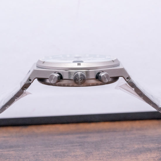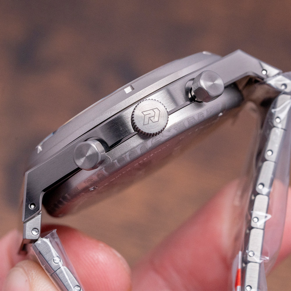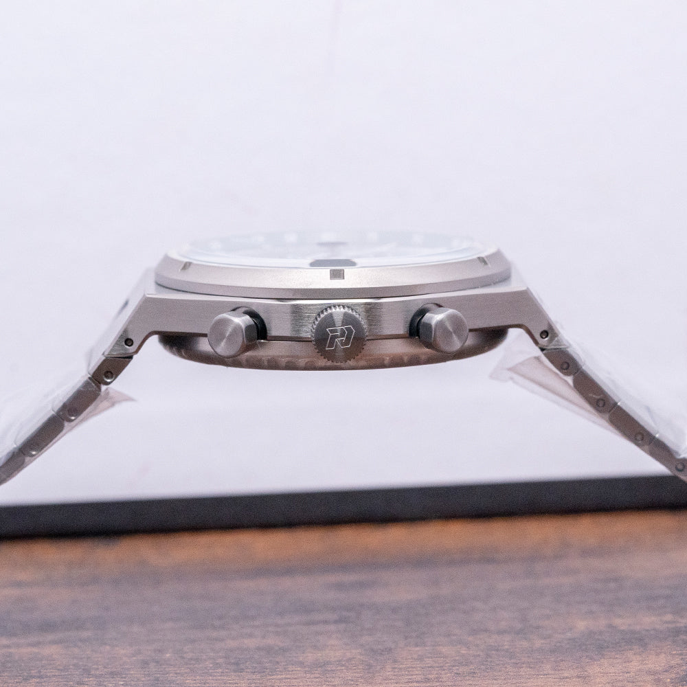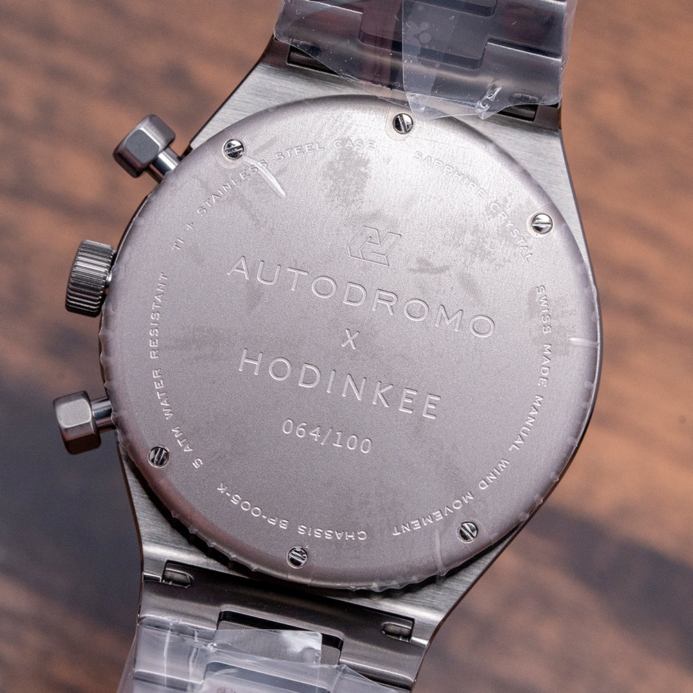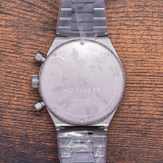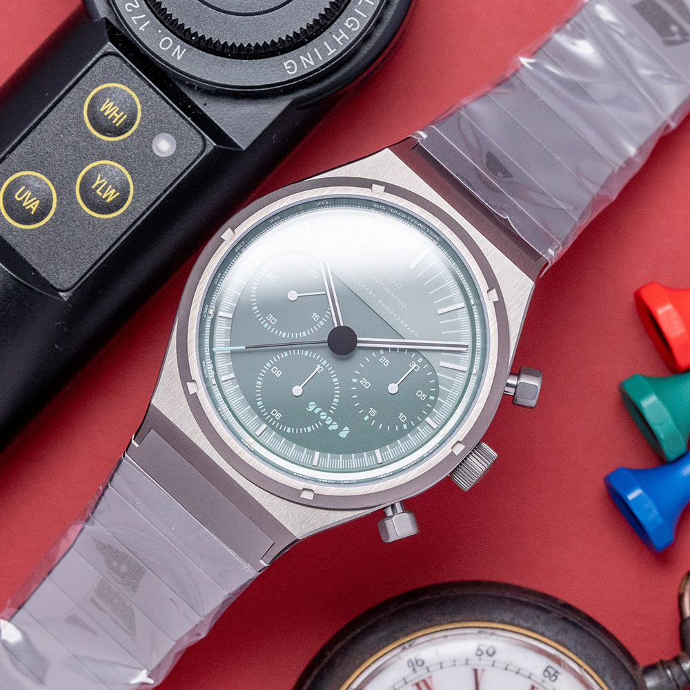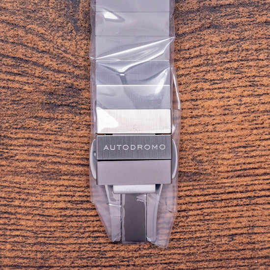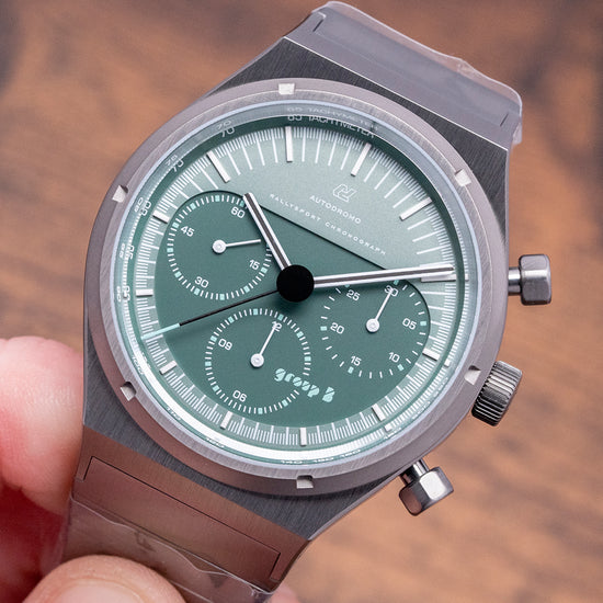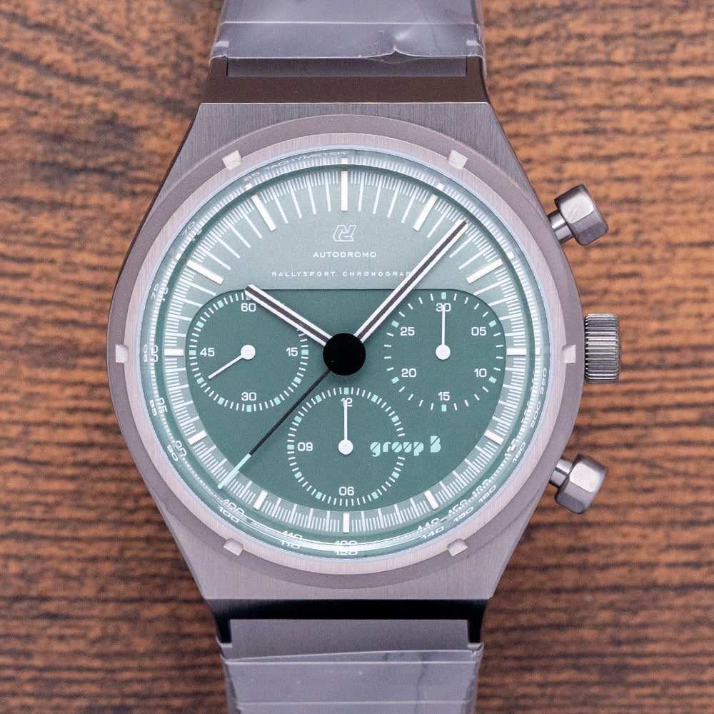 Here we have an Autodromo Group B Rally Sport Chronograph H01 for Hodinkee, which is a limited edition of 064/100 pieces; this partnership represents a modern tribute to the vintage elegance of Rally Group B's cars, combining their form and function which created truly legendary vehicles. The 40mm tonneau-shaped case is made with a bimetal construction of dark grey IP-coated stainless steel mid-case and Titanium bezel and Titanium case back; brushed stainless steel has crisp lines leading to the drilled angular lug, a lug-to-lug length of 50.5mm and a case thickness of 12.5mm give the watch an impressive wrist presence. Down the right side, we have the hexagonal piston chronograph pushers and a signed crown in the centre. The stepped brushed Titanium bezel has six notches cut into it, holding a bevel-edged sapphire crystal above a dynamic shades of green dial. An outer dark green Tachymeter scale surrounds the precisely executed minute track with baton indexes marking the hours; at 3 o’clock, a 30-minute register; at 6 o’clock, a 12-hour register; and finally at 9 o’clock, the continuous seconds register, each with white accents and hands. The baton hands have a black line through them and are complemented by a green-tipped chronograph hand. The combination of the hands and dials reminds us of the dashboard dials found on those iconic Rally Group cars. At 12 o’clock, we have the Autodromo motif and “Rallysport Chronograph” printed underneath; through the 6 o’clock register “, Group B” completes this monochromatic motorsport-inspired chronograph. On the reverse, a screwed-down Titanium case back with Autodromo X Hodinkee and the number out of 100 engraved into it, inside a manually wound Sellita SW 510 MB, 23 jewels, beating at 28,800 beats per hour; this movement is based on the Valjoux 7750 design. It comes paired with its 21mm grey IP-coated stainless steel bracelet with a signed hidden clasp, and the watch comes with its Autodromo presentation box and paperwork.