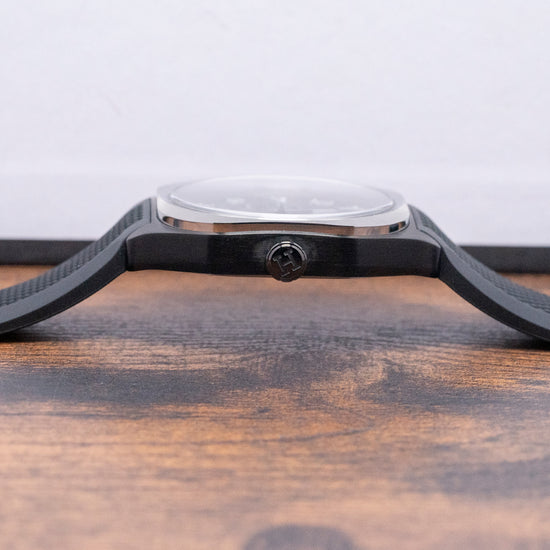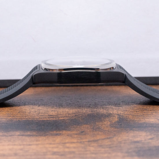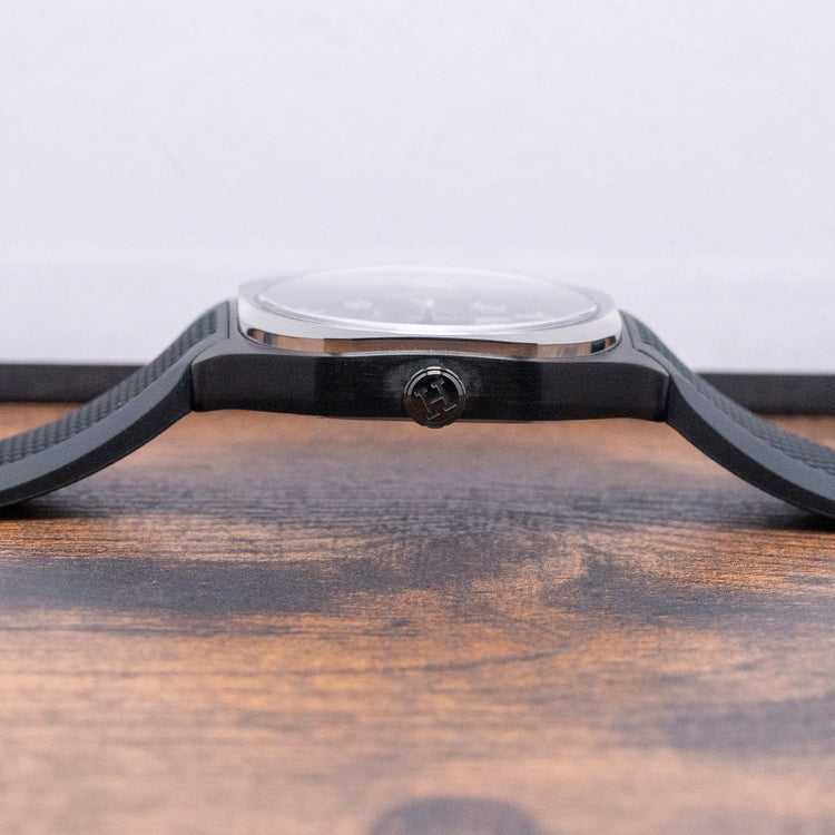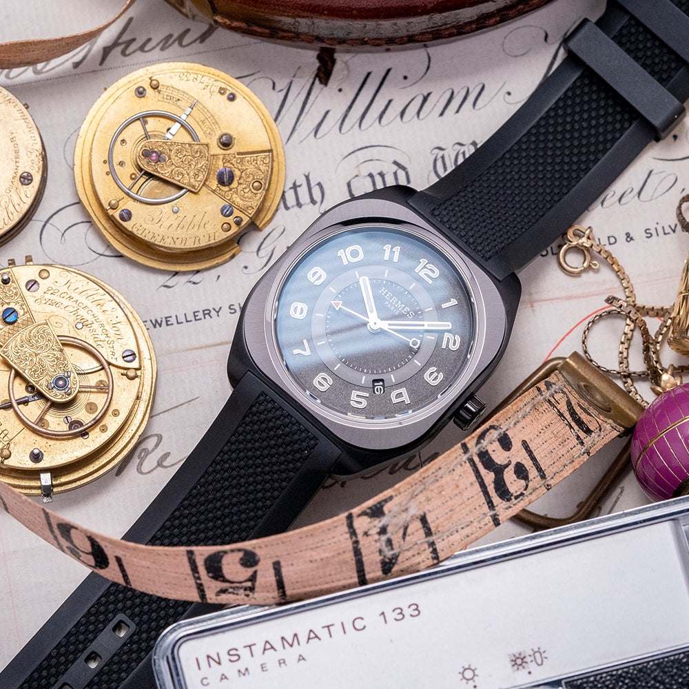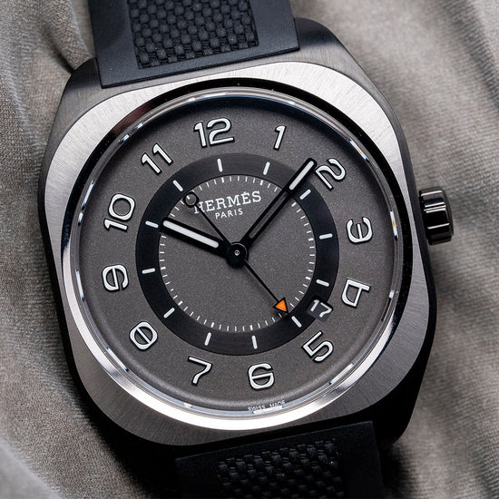 Here we have a Like-New 2023 Hermès H08 Titanium Black Automatic with a brushed 38.5mm Black PVD coated Titanium cushion style case. Its straight flanks taper towards the lugs, leading to a lug-to-lug length of 46mm and a case thickness of 10mm to give the watch an impressive wrist presence. On the right is a signed crown with deep knurling for grip. A radially-brushed Titanium bezel has polished chamfer edges holding a sapphire crystal AR coated above a grey PVD-coated dynamic dial. Stylised numerals coated with Super-LumiNova surround a satin-brushed black minute disc highlighted with white markers at the hour; at 4.30, we have a colour-matched date window, black background and white numerals. The baton hour hand is filled with Super-LumiNova, and the skeletonised minute hand tipped with lume is complemented by an orange arrow pointed sweeping second hand. At 12 o’clock, the Hermès Paris motif completes this sophisticated, innovative timepiece. On the reverse, a screwed-down Titanium exhibition case back, inside an automatic Hermès Cal. H1837, 28 jewels, beating at 28,800 beats per hour, made for Hermès by Vaucher Manufacture Fleurier, this double barrel movement is made up of 193 components, and an attractive repeating “H” is engraved across the movement and rotor and has hand winding and hacking seconds for your convenience. It comes paired with its 20mm Hermès black rubber strap and a signed Titanium deployant buckle and comes with its Hermès presentation box and paperwork.