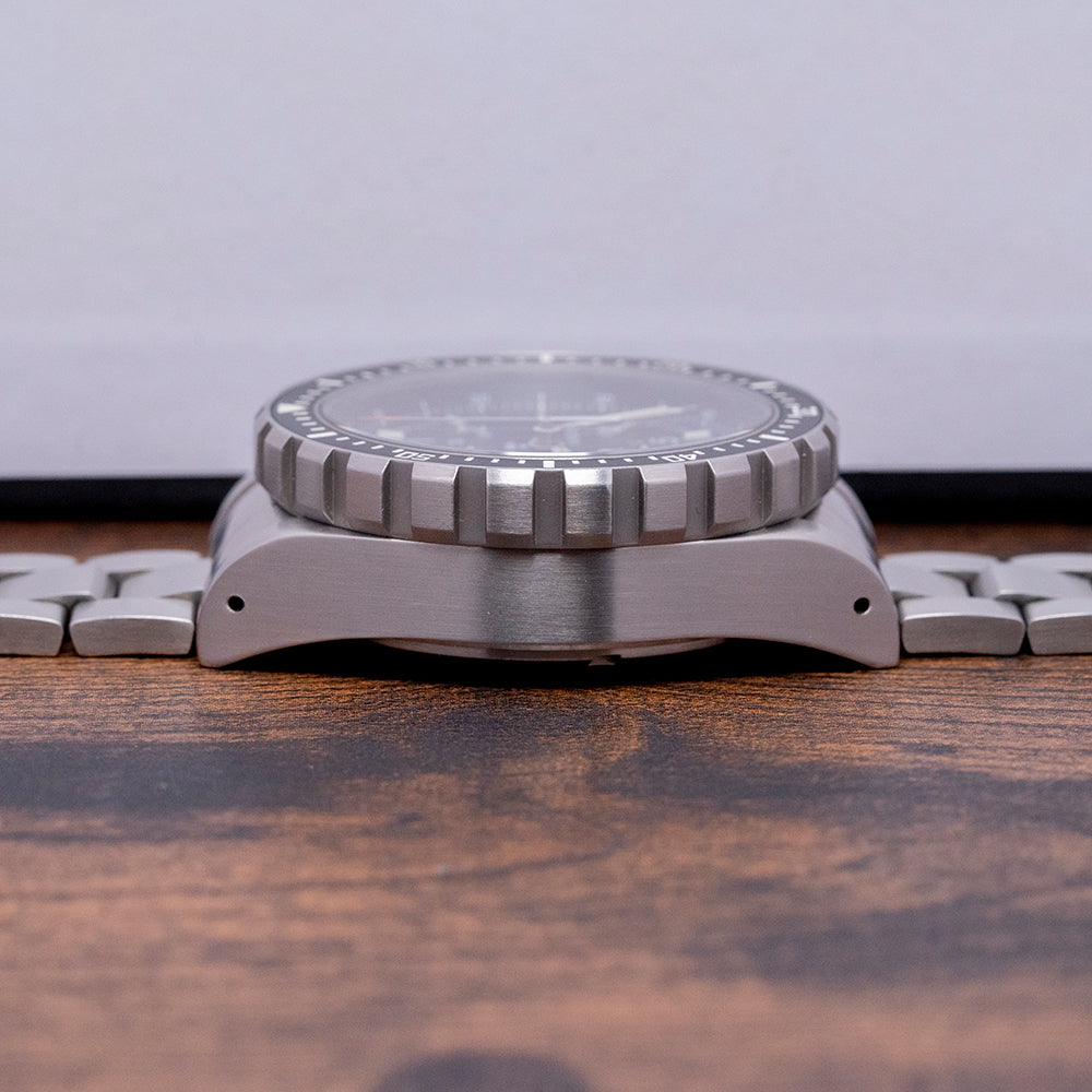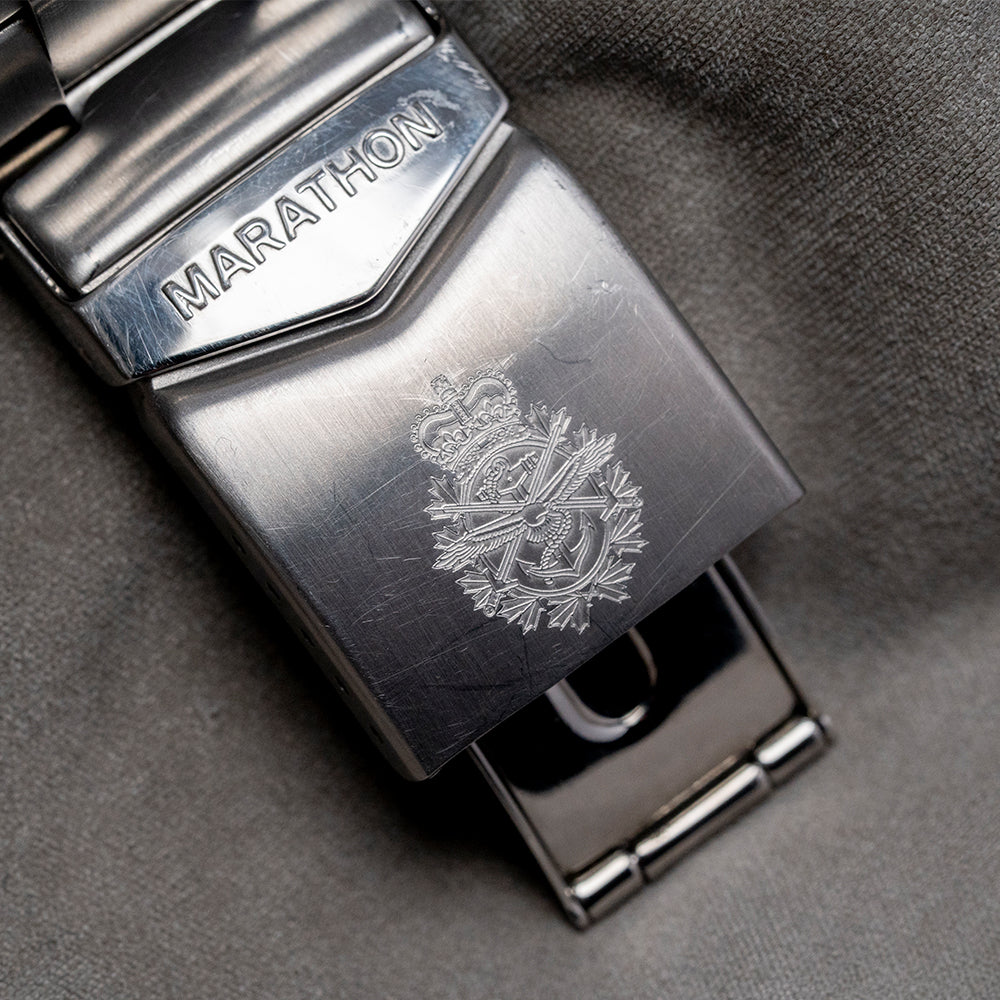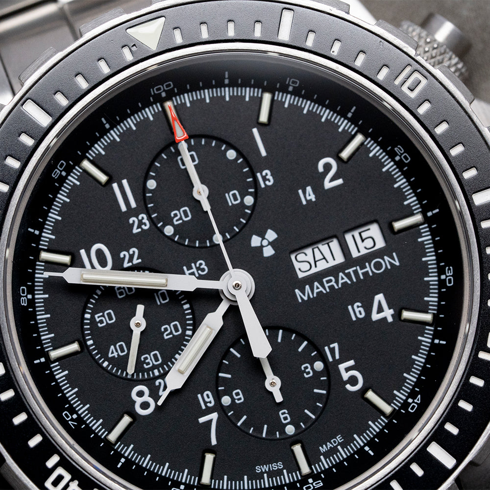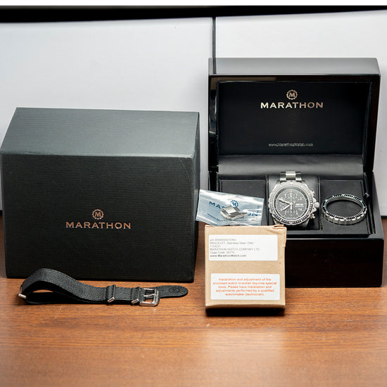 Here, we have a robust Marathon 'CSAR' Automatic Chronograph Jumbo 46mm, known as Chronograph Search and Rescue (CSAR). First introduced in the 1990s, it was developed and specified by the Canadian Government for special Search and Rescue operations. A brushed 46mm stainless steel case curves over your wrist thanks to tapered drilled lugs, and a lug-to-lug length of 55mm and a case thickness of 17.5mm give the watch an impressive wrist presence. Down the right side we have the screw-down chronograph pushers with cross-hatch knurling and a large screw-down crown with cross-hatch knurling for grip protected by crown guards. The unidirectional 120-click bezel has thick knurling for ease of grip when wearing gloves and a black 60-minute dive insert holding a flat sapphire crystal AR coated above a matte black dial. An outer 1/100 of a minute Decimal scale is precisely executed surrounding applied Tritium Gas Tubes and MaraGlo baton indexes above large 12-hour Arabic numerals and smaller 24-hour numerals marking the hours; at 3 o’clock, we have a day/date window, at 12 o’clock a 30-minute register, at 6 o’clock a 12-hour register and finally at 9 o’clock a small seconds register. Thick syringe hands have Tritium Gas Tubes and MaraGlo for a distinctive green glow complemented by a tapered red arrow-tipped chronograph hand. We have the Marathon motif with H3 and the radioactive symbol. In 1973, the H3 and Radiation symbol was added to US military specification requirements; the H3 stands for radioactive Tritium, which gives that exceptionally long-lasting bright lume. On the reverse, a screw-down solid case back with the details of the watch around its edge and the Government specification ID numbers engraved for the following: ISO 6425, 26 MILLICURIES is the amount of Radioactive material in the watch, NRC ID- Nuclear Regulatory Commission ID number for Tritium, next is the General Services Administration contract number with the ID number for suppliers to government agencies, inside an Automatic ETA/Valjoux 7750, 25 jewels, beating at 28,800 beats per hour, this workhorse chronograph movement has quick-set date, hacking seconds and hand winding for your convenience. It comes paired with its 22mm brushed stainless steel 3-link bracelet secured by a signed deployant clasp and flip lock engraved with the Canadian Forces tri-service logo. All links and an additional 22mm NATO strap are provided, and the watch comes with this Marathon presentation box, spare bezel and paperwork.