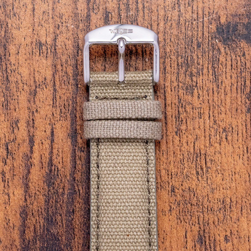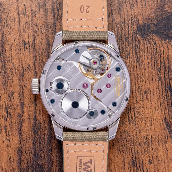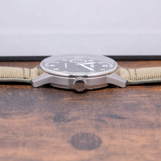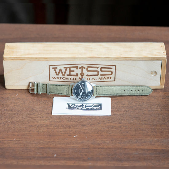 Here, we have a NOS 2014 Weiss Standard Issue Field Watch 'LA Dial', a modern interpretation of the classic field watch. Thanks to the tapered flat-ended lugs, its 42mm brushed round case sits comfortably on your wrist. Brushed centre flanks lead to a lug-to-lug length of 48.5mm and a case thickness of 11.5mm. On the right side, we have a large crown with deep knurling for grip. The polished smooth bezel holds a sapphire crystal above a striking monochromatic black and white dial. An outer minute track is precisely executed surrounding Arabic numeral indices coated in SuperLumiNova, marking the hours; at 9 o’clock, we have a small seconds sub-dial with a tapered hand and clear markings, elegant sword hands are hand-painted with SuperLumiNova; at 12 o’clock we have the Weiss motif and at 6 o’clock “Los Angeles, CA” proudly stated on this distinctive field tool watch. On the reverse, a sapphire exhibition screw-down case back showcasing the manually wound Weiss Cal. 1001, 17 jewels, beating at a leisurely 18,000 beats per hour; this signed movement is based on the ETA 6497 and is finished in Côte de Genève and blued screws. It comes paired with its original 20mm unused olive drab fabric strap with a comfortable leather lining and a signed polished pin buckle, and it comes with a Weiss presentation box and booklet.