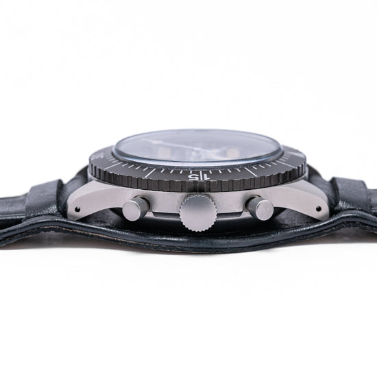 Here we have a Sinn x The Rake & Revolution 155 Bundeswehr "Dark Star", issued in a limited run of 150 pieces, it's the rarest of the 3 re-editions produced, made in collaboration with Revolution and Rake magazines, designed for military pilots of the West German Federal Defense Force (Bundeswehr). They were initially made by a company called Leonidas, which was later purchased by Heuer. Its 43mm stainless steel round case is bead-blasted with drilled lugs, a lug-to-lug length of 51mm and a case thickness of 15mm giving the watch an impressive wrist presence. The bezel with its 60-minute scale has a “ghost” effect giving the appearance of a watch faded by the sun over time, a flat acrylic crystal sits above a matte black dial. An inner 60-minute track and large Arabic numeral indexes coated in specially coloured Super Luminova to perfectly emulate the look of aged tritium seen on vintage watches, at 3 o’clock the 30-minute register and at 9 o’clock the continuous 60 seconds register. Broad syringe hands and a chronograph hand are coated in the same vintage colour Super Luminova, at 6 o’clock you find a "DarkStar" in place of the original 3H logo. On the reverse a screw-down case back, inside an automatic Cal. SW 510, 27 jewels, 28,800 beats per hour. Cam-operated chronographs. The watch comes fitted on its Sinn 20mm Bundeswehr strap with a signed buckle plus an additional Sinn NATO strap included, and the watch comes with its Sinn presentation box and paperwork.