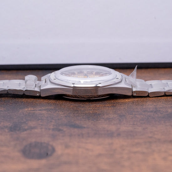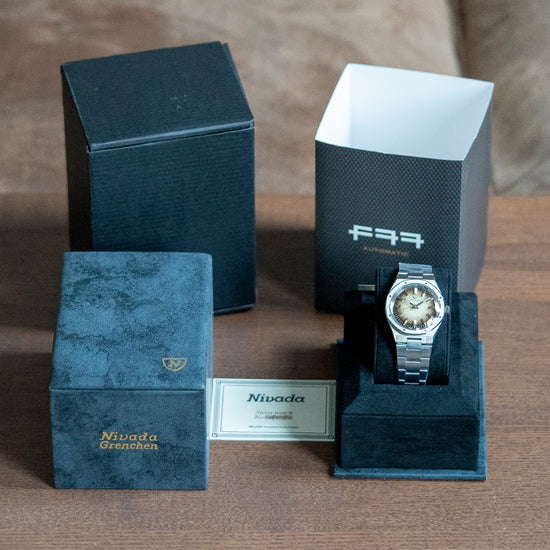 This watch is sold with its original Nivada box and paperwork. The watch comes paired with its original integrated 21.5mm 3-Link brushed stainless steel bracelet with a signed folding clasp. The watch is from Circa. 2023 and is sold in Stickered condition, as you can see from the photographs. The watch comes with its Manufacturer's Warranty.