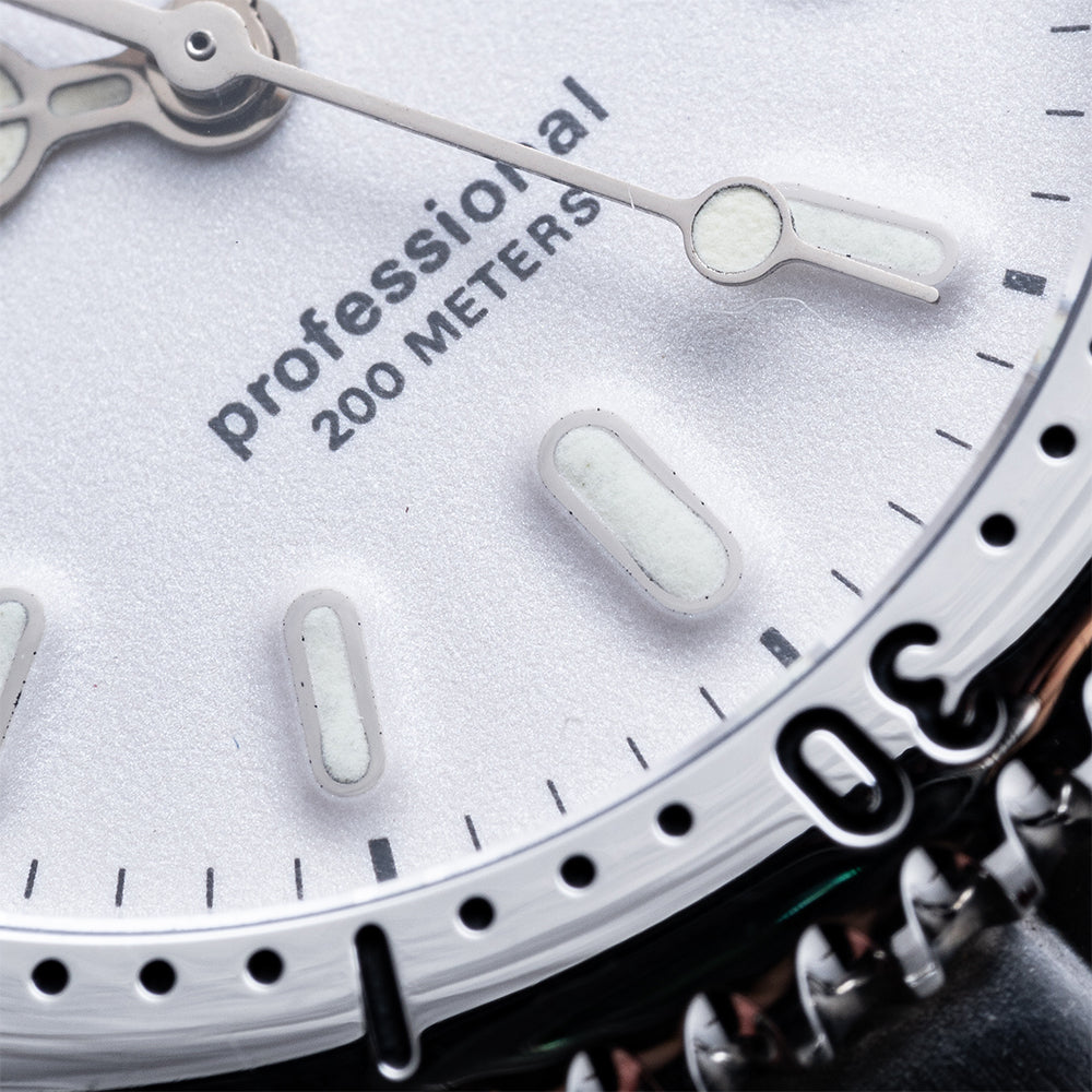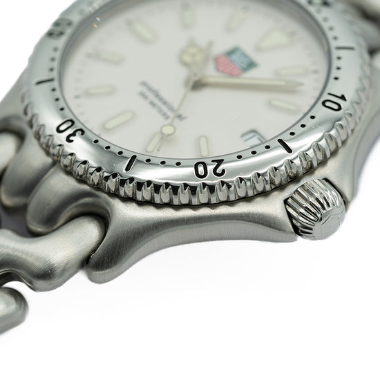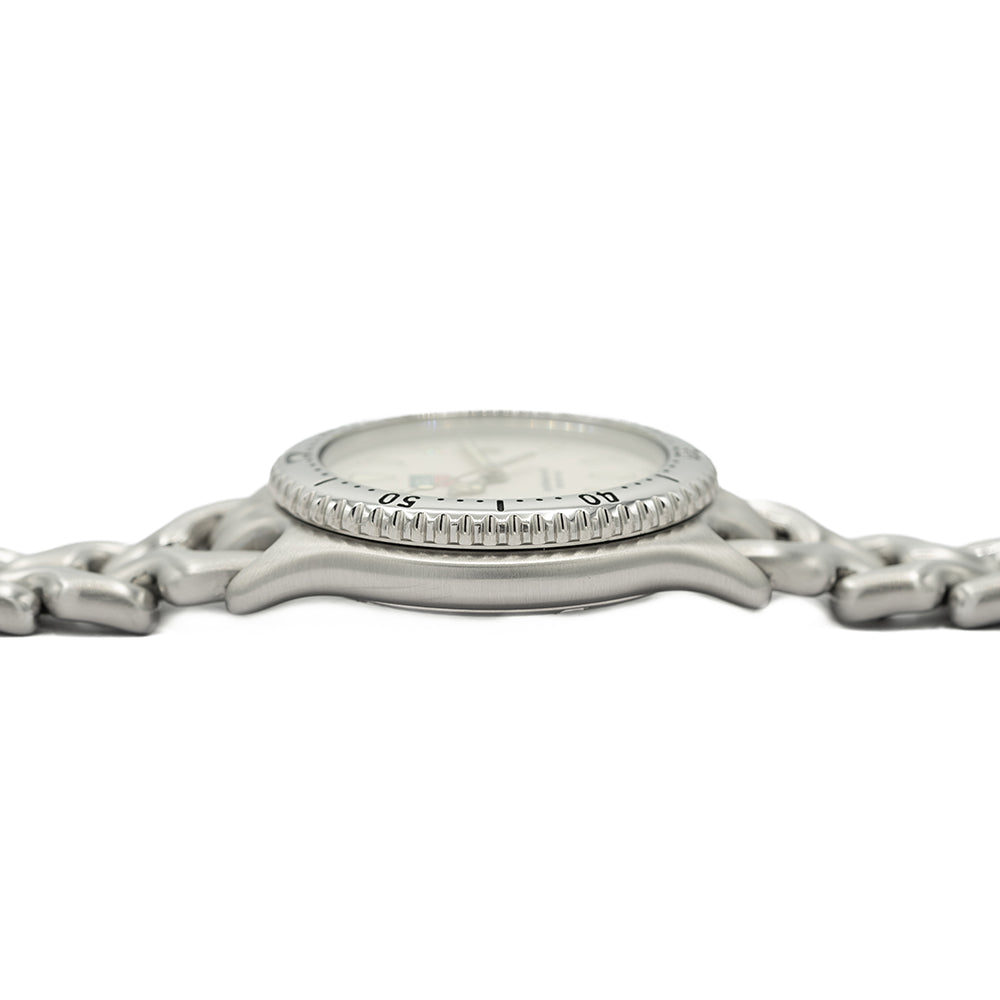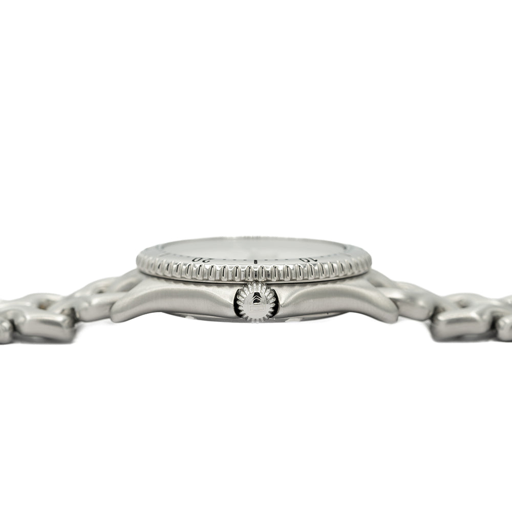 Here we have a TAG Heuer SEL Series Quartz White Dial S99.013 with a 33.5mm satin-finished stainless steel case, this is part of the “Sports Elegance” range designed by Eddie Schopfer. The rounded edges lead to a lug-to-lug length of 37.5mm and a case thickness of 8mm ensuring a comfortable fit on your wrist, on the right side is a signed screw-down crown protected by crown guards. The unidirectional bezel has deeply engraved numerals painted in black and deep knurling around its edge for extra grip. The flat sapphire crystal sits above a white dial, an outer minute track is precisely printed with applied rounded baton indexes infilled with luminance marking the hours, and at 3 o’clock a date window. Elegant Mercedes hands infilled with luminance complemented with a lollipop counterweighted second-hand, at 12 o’clock an applied TAG Heuer motif and at 6 o’clock “Professional 200m” completes this elegant sports watch. On the reverse a screw-down case back with an engraved TAG Heuer shield in the centre, inside a Quartz movement. The watch comes fitted on its 18mm TAG Heuer sculpted link stainless steel bracelet with a signed folding clasp.