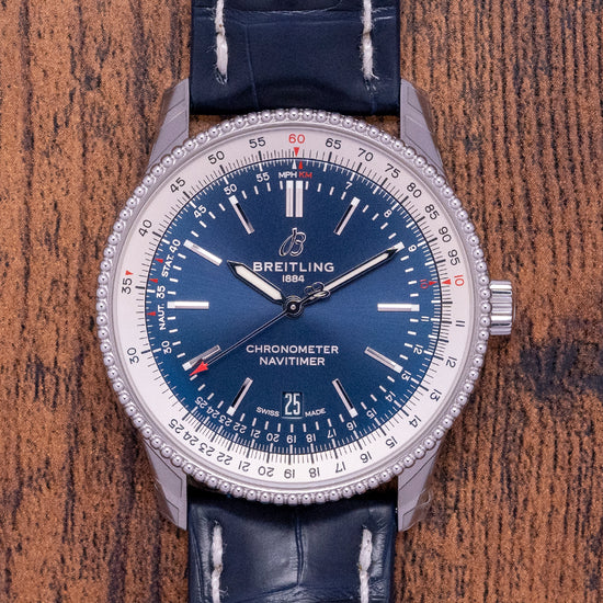 Here we have an unworn 2020 Breitling Navitimer Automatic 41 Blue A17326211C1P3 with a polished and brushed 41mm stainless steel case that curves over your wrist with chamfered-edges tapered lugs, a lug-to-lug length of 48mm and a case thickness of 9.5mm give the watch an impressive wrist presence. On the right side, a twin gasket signed crown. The bidirectional stainless steel beaded bezel holds a cambered sapphire crystal AR coated on both sides above a blue dial, an outer bi-directional rotating logarithmic slide-rule navigation computer makes complex mathematical calculations helpful to pilots, you can measure a lot of things such as gasoline consumption, miles per minute, ground speed, rate of descent/climb, distance in descent/climb and nautical / statute mile conversion. Applied baton indexes mark the hours and catch the light as you rotate your wrist, at 6 o’clock a date window. Slender sword hands infilled with Super LumiNova complemented by a Breitling ``B” counterweighted sweeping red-tipped second hand. The signature applied Breitling “B” motif sits at 12 o’clock, and the “Chronometer Navitimer” text is precisely executed at 6 o’clock to complete this vintage-inspired tool watch. On the reverse a screw-down case back with the Breitling wings engraved into it, inside an automatic Breitling Cal. 17, 25 jewels, beating at 28,800 beats per hour, this Chronometer Certified (COSC) movement is based on the ETA 2824-2 which has been modified to Breitling standards. The watch comes paired with its Breitling 22mm blue leather strap with a signed pin buckle and the watch comes with its Breitling presentation box, travel case and paperwork.