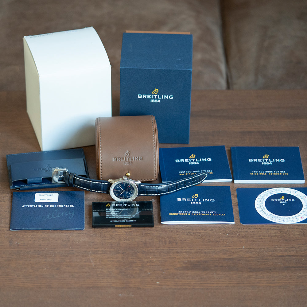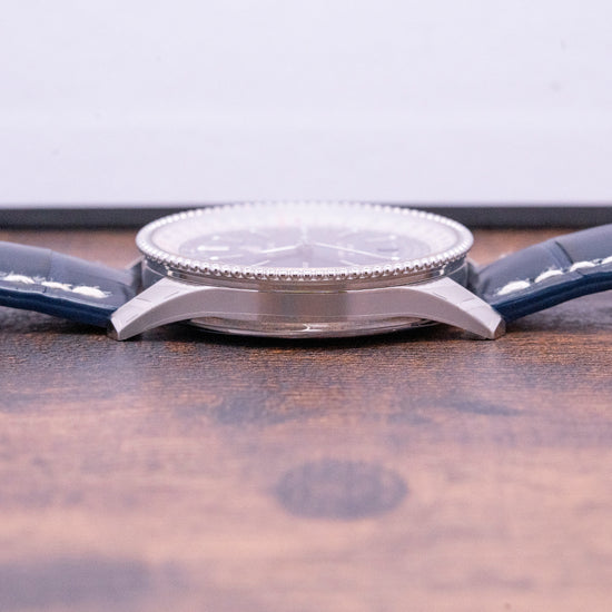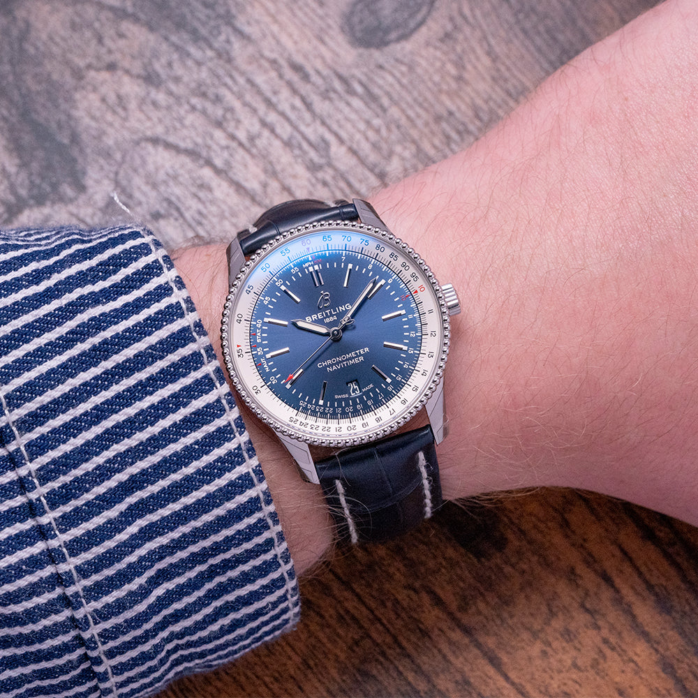 This specific reference Breitling Navitimer Automatic in 41mm with the blue & white dial is now discontinued, which is a shame as this is arguably the nicest configuration in my opinion. Thankfully, you can snap it up brand new and fully stickered from us at a large discount on RRP today!