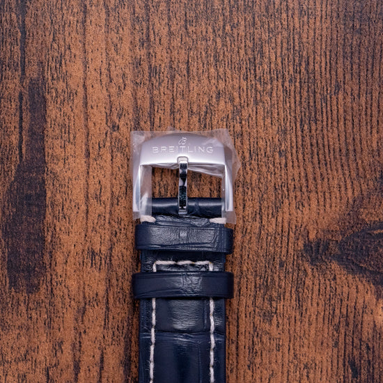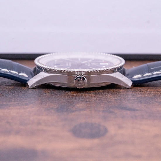 This watch is sold with its original Breitling box, travel case and Breitling paperwork. The watch comes paired with its original Breitling 22mm blue leather strap with a signed pin buckle. The watch is from February 2020 and is sold in unworn condition, as you can see from the photographs. The watch comes with our 12-Months Warranty.