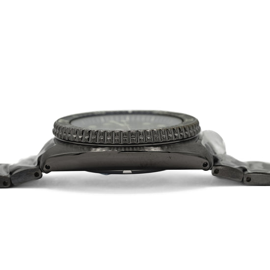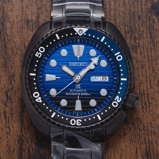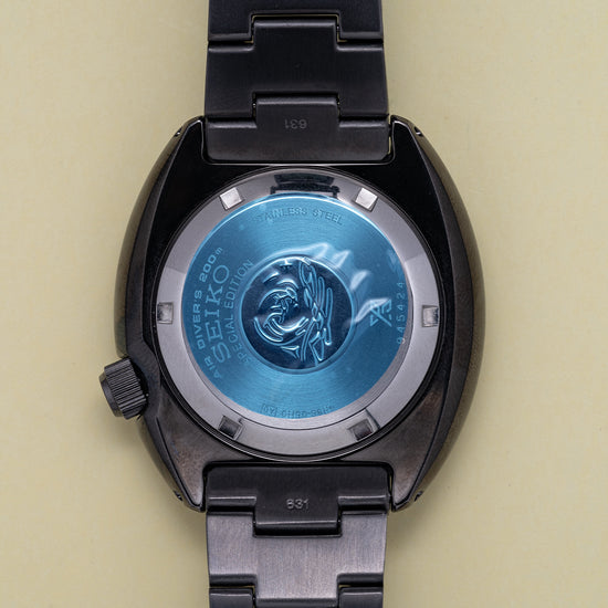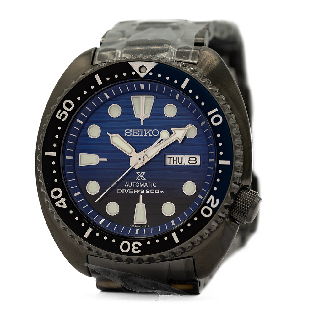 Here we have an Unworn 2020 Seiko Black Turtle "Save The Ocean" SRPD11K1, released in 2019 the Save the Ocean is a recreation of the cushion cased 6000 series from the mid-’70s, with a portion of the proceeds from the original sale going to Fabien Cousteau’s Ocean Learning Centre, a non-profit organisation dedicated to learning and marine conservation. The 45mm cushion case has a curvaceous shape, with a 48mm lug-to-lug length that fits comfortably on the wrist despite its case dimension, Seiko has got wrist ergonomics so right. The case, bezel, crown and bracelet are coated in a Seiko proprietary black Ion Plated coating and the unidirectional dive bezel is dark blue for the first 20 minutes and black for the rest with numerals in white, a nice contrast. Seiko Hardlex protects a blue dial that has a gradient from light to dark just like the ocean depths, a nice touch. Horizontal lines highlight this gradient and catch the light in an interesting way making it quite unique amongst Turtles. The day/date sits at 3 o’clock, disc and baton indexes are liberally coated in LumiBrite giving them dimension. Broad arrow and syringe hands again are coated in LumiBrite, complete with a slim seconds hand that has a lollipop counterbalance. The screw-down case back is both polished and brushed with engraving, detailing that makes this stand out from the usual. Inside beats a truly modern workhorse the Seiko Automatic 4R36, 24 jewels, 21,600 beats per hour, both hacking and hand winding. The watch comes fitted on its original Seiko 22mm black Ion Plated bracelet with a signed push-button release three-fold clasp and dive extension and comes with its Seiko presentation box and paperwork.