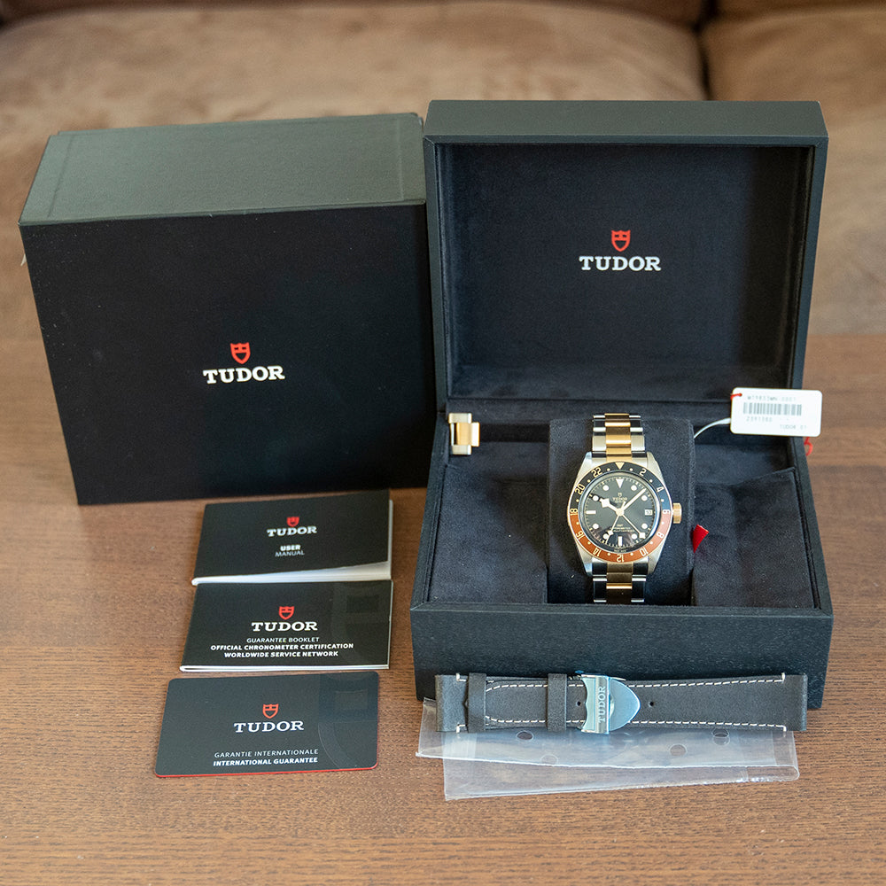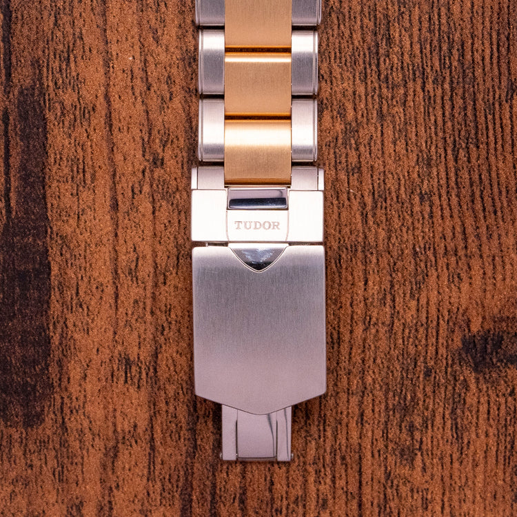 This watch is sold with its original Tudor Box & Paperwork. The watch comes paired with its original 22mm stainless steel and 0.2mm 18ct Yellow Gold cap centre link, with its Tudor signed clasp, all links included and an unworn 22mm Tudor strap with deployment clasp. The watch is from September 2022 and is sold in unworn condition, as you can see. The watch comes with its Manufacturer's Warranty.