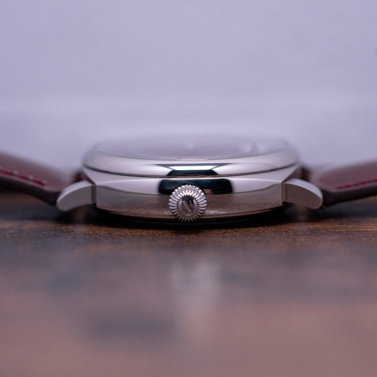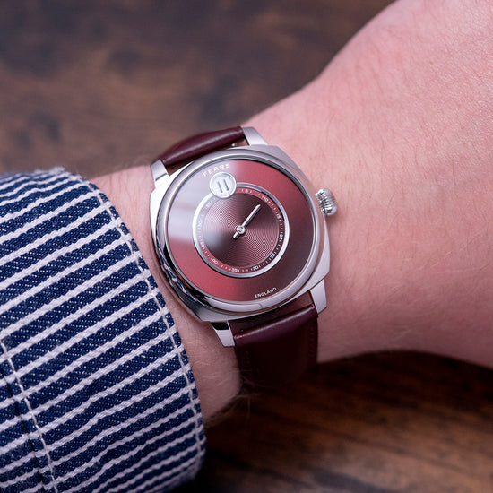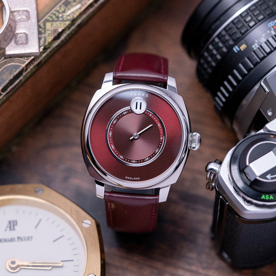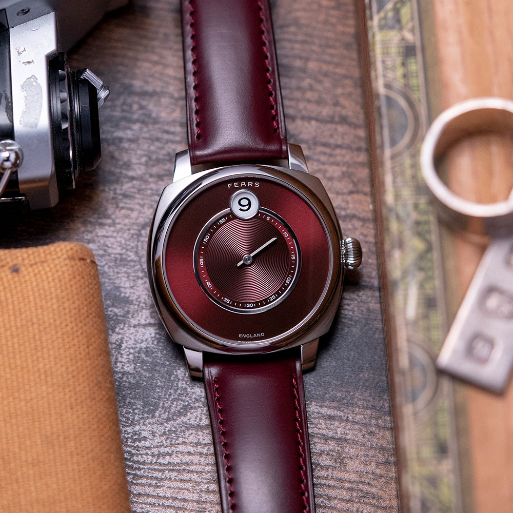 This watch is sold with its original Fears bespoke wooden presentation box and paperwork. The watch comes paired with its original 20mm Fears Belgium handmade Burgundy Red, British calf leather, tanned in the UK, lined in Alcantara and a signed pin buckle. The watch is from January 2023 and is sold in unworn condition as you can see from the photographs. The watch comes with its Manufacturer's Warranty.