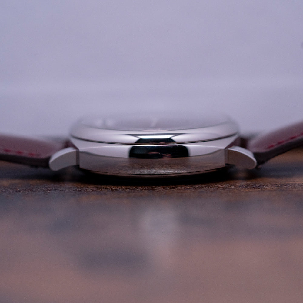 Here we have an Unworn 2023 Fears Christopher Ward Alliance 01 Jump Hour, a unique collaboration between two powerhouses of the British Watch & Clock Makers Alliance. The Alliance was set up in November 2020 as a Trade body representing 75 Brands across the British Isles including the Republic of Ireland, such brands as Bamford London, Christopher Ward, Fears, Farer, Elliot Brown, Isotope, Marloe Watch Company, MHD Watches, Pinion, Schofield, Studio Underdog and many others. This special watch was only available to Alliance club members in very limited numbers of just 50 watches. Engraved under the four lugs are the logos of Fears, Christopher Ward, and the Alliance and on the fourth we have the number of the watch ranging from 01-50. The elegant polished 40.5mm 316L stainless steel Brunswick case takes its inspiration for the case from a Fears watch originally made in 1924, manufactured in Germany, it is wonderfully curvaceous, not a flat surface to be found. The finish and depth of polishing are quite exquisite and showcase the skill and attention to detail of the German manufacturers. To facilitate daily winding the watch features a traditional “onion” shaped crown, signed with the Fears Pipette. The smooth polished bezel holds a domed sapphire crystal ARdur coated inside and out, above a stunning Burgundy Red matte lacquered dial. This distinctive dial is made up of an outer sunburst ring, at 12 o’clock we have the hour window in white lacquer with black ink Fears “Edwin” typeface, intersecting a frosted minute chapter ring in silver ink numerals and a polished ring surrounds the deeply engraved concentric guilloche centre with the Fears shaped” minute hand that is Rhodium plated, half mirror diamond polished and half frosted. At 12 o’clock we have the Fears motif, and at 6 o’clock “England” in silver ink completing this mesmerising dial. The light magically plays with the different surfaces as you rotate your wrist. Inside an automatic Modified Sellita SW200, this JJ01 movement has a module developed in-house by Johannes Jahnke, a former master watchmaker of Christopher Ward and is decorated with the Christopher Ward Twin Flags logo and Rhodium plated. The watch comes paired with its 20mm Fears Belgium handmade Burgundy Red, British calf leather, tanned in the UK, lined in Alcantara and a signed pin buckle, and the watch comes with its original Fears bespoke English Ash wooden presentation box stained in Fears Blue and lined in cream suede and Fears paperwork.