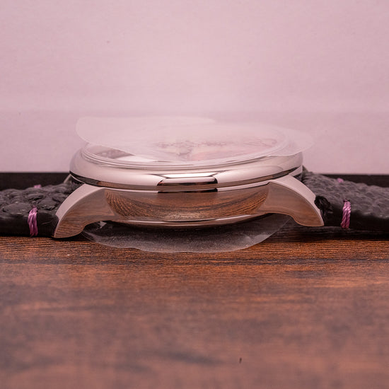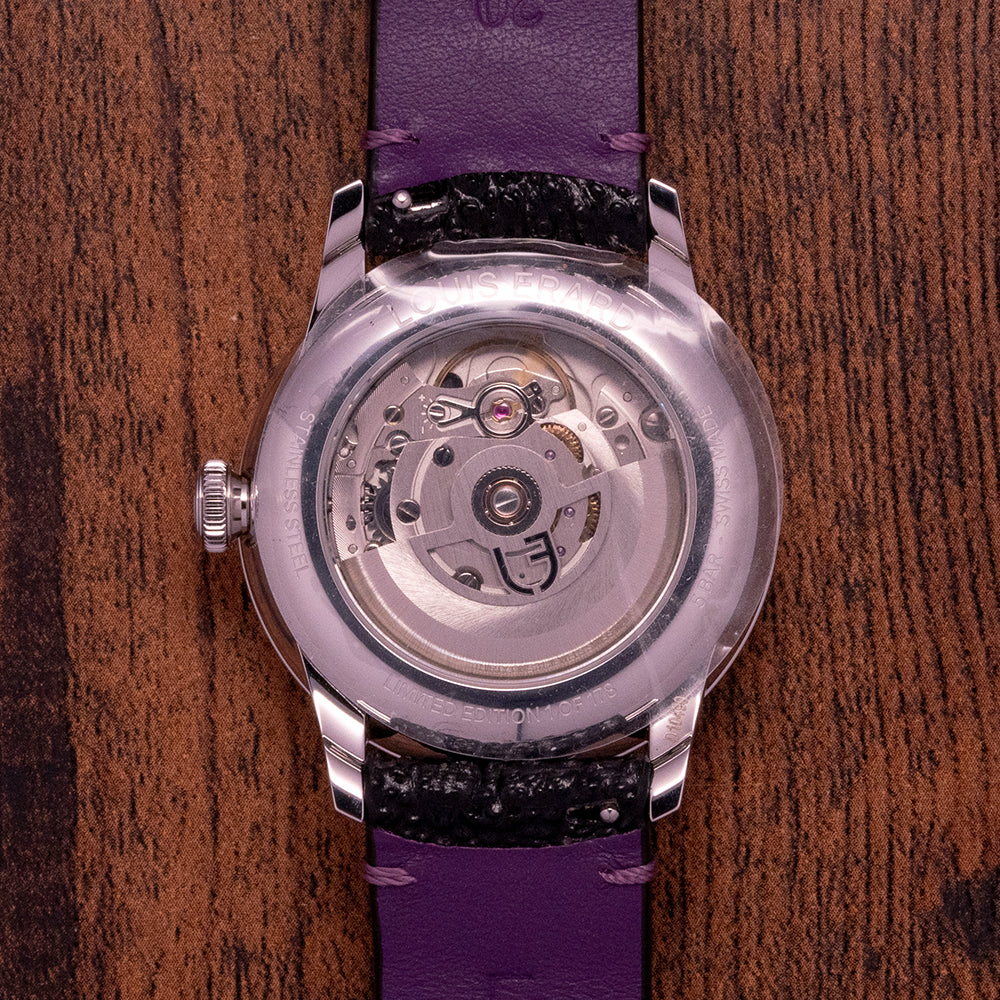 This watch is sold with its original Louis Erard presentation box and paperwork. The watch comes paired with a 20mm Louis Erard black toad leather strap, purple-dyed rabbit leather lining and a polished steel pin buckle. The watch is from May 2023 and is sold in Unworn condition, as you can see from the photographs. The watch comes with its original Manufacturer's Warranty.