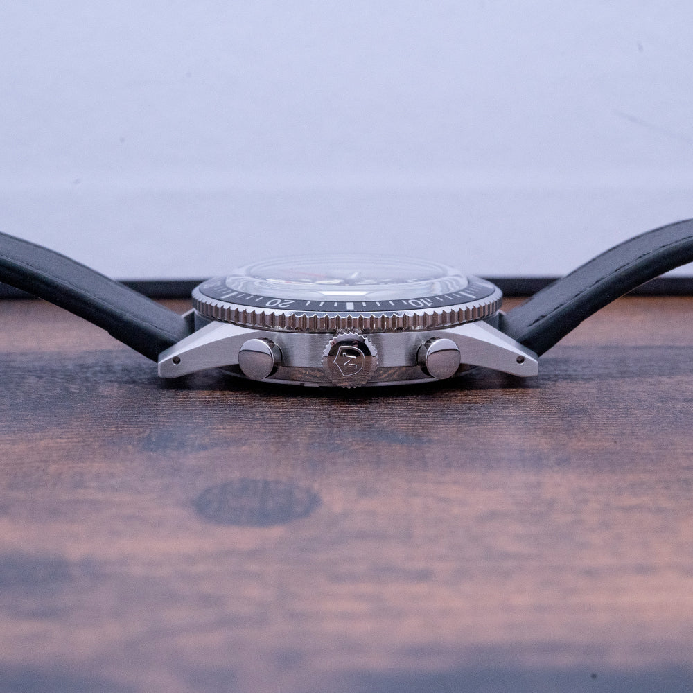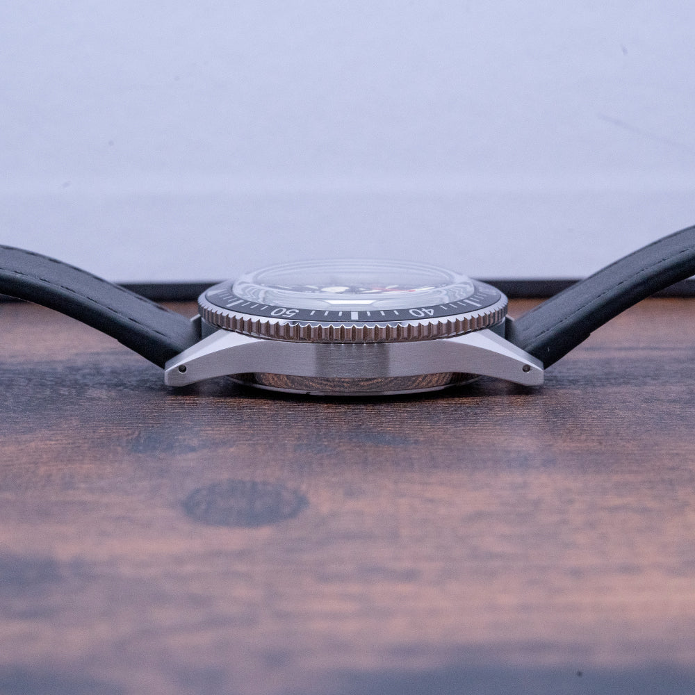 Here we have an Unworn 2023 Nivada Chronoking Mecaquartz Limited to 100 with a 38.5mm brushed and polished stainless steel case that curves over your wrist with tapered flat-ended drilled lugs, a bevel edge flows along its flanks to a lug-to-lug length of 47mm and a case thickness of 13mm ensuring a comfortable fit on your wrist. Taking its design cues from the legendary Chronoking of their past, they have added a pleasing modern contemporary flare. Down the right side, we have the polished piston-style chronograph pushers and a large signed crown in the centre. A bidirectional bezel has a black aluminium insert with a silver 60-minute dive scale holding a double-domed sapphire crystal, in keeping with its vintage aesthetic, reminding us of the domed acrylic crystals of the past, above a matte black dial. An outer Tachymeter scale above the precisely executed minute track surrounds baton indexes coated in cream Super-LumiNova marking the hours, at 3 o’clock 24-hour register, at 6 o’clock continuous seconds register and finally at 9 o’clock a 60-minute register, each in cream, a nice contrast to the black dial, slender baton hands tipped with Super-LumiNova are complemented by a tapered red chronograph hand matching the stick hands found on the two registers. At 12 o’clock we have the Nivada motif and “Chronoking” printed underneath completing this vintage-inspired sports chronograph. On the reverse a screw-down case back with the details of the watch around its edge and the Nivada Grenchen motif in the centre, inside Meca-Quartz Seiko VK63 this mechanical quartz hybrid has a tuning fork-type quartz crystal, you get the same kind of mechanical resistance when you engage the pushers and a satisfying snap back of the chronograph seconds hand on reset. The watch comes paired with its 20mm leather strap with a signed pin buckle, and the watch comes with its Nivada presentation box, swing tag and paperwork.