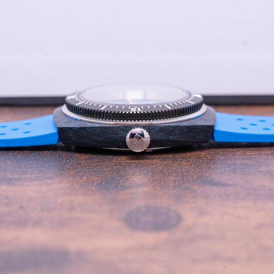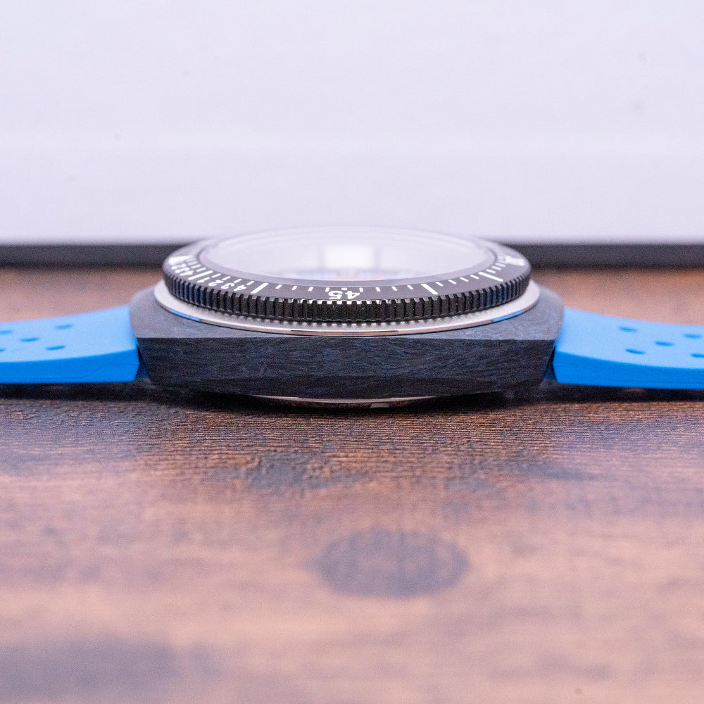 Here we have an unworn 2023 Tissot Sideral S Blue Carbon Powermatic 80 with a futuristic 41mm black and blue marbled Forged Carbon Tonneau-shaped case that comfortably sits on your wrist with tapered lugs and a cut-out for the strap to fit perfectly between the lugs. A modern reimagining of their futuristic Fibreglass timepieces that were released in 1971. A lug-to-lug length of 46mm and a case thickness of 14mm give the watch an impressive wrist presence, and on the right side is a signed screw-down crown. A stainless steel ring fits between the carbon case and the black rotating bezel has white numerals and markings with a 10-minute countdown holding a domed sapphire crystal AR coated above a black dial. Outer minute numerals surround a blue minute ring with white markings and thicker batons for the hours, an inner 10-minute countdown in green and red is precisely marked, and at 3 o’clock a framed date window, slender baton hands are infilled with SuperLumiNova complemented by a red “T-Bar” second hand, at 9 o’clock we have the Tissot motif and at 6 o’clock “Powermatic 80” completes this vintage-inspired timepiece. On the reverse a screw-down exhibition case back has the details of the watch around its edge showcasing an automatic Powermatic 80 beating at 21,600 beats per hour, the movement is based on the ETA 2824-2 and has an impressive 80-hour power reserve, it is laser regulated similar to the Sistem51 movements. The watch comes paired with its 20mm blue rubber sports-style strap with quick release.