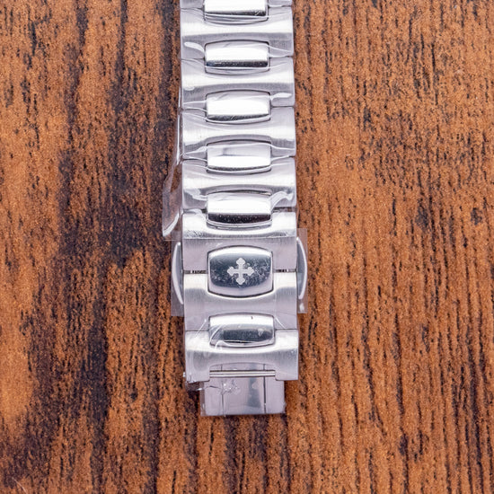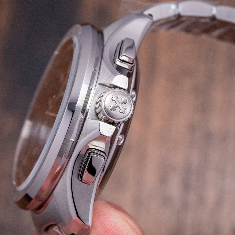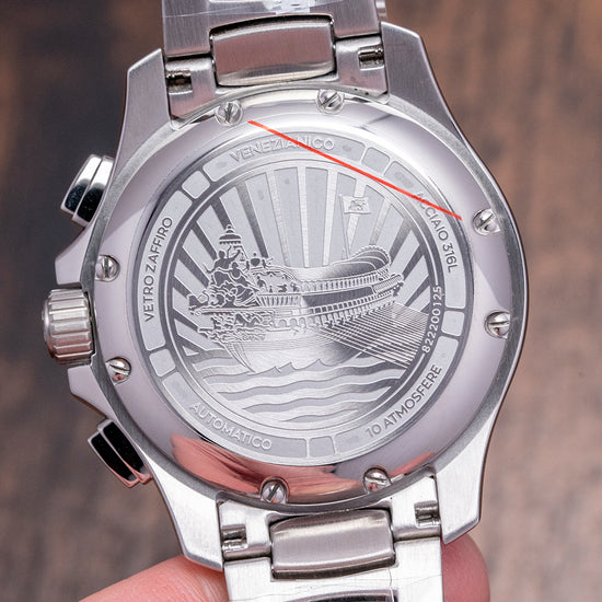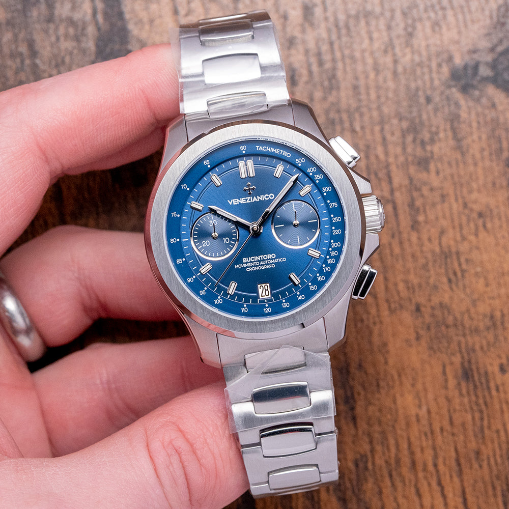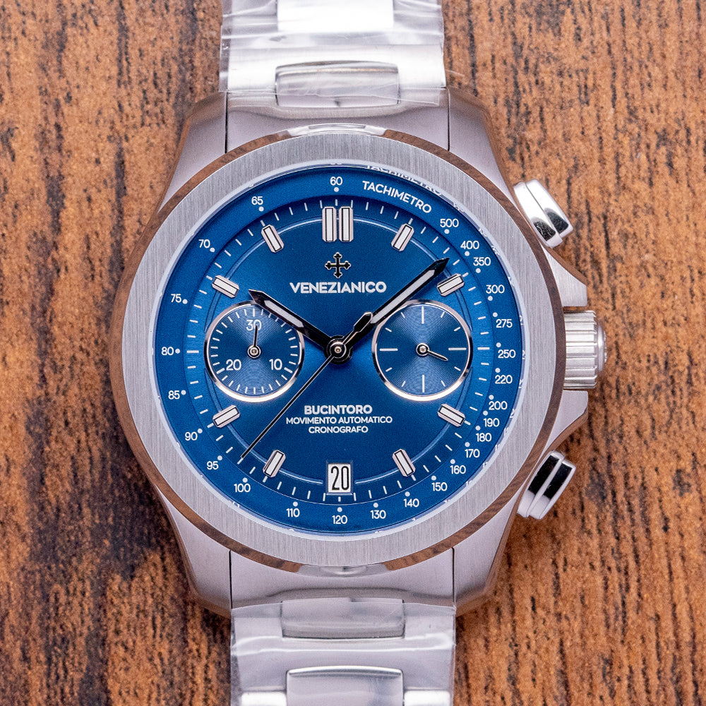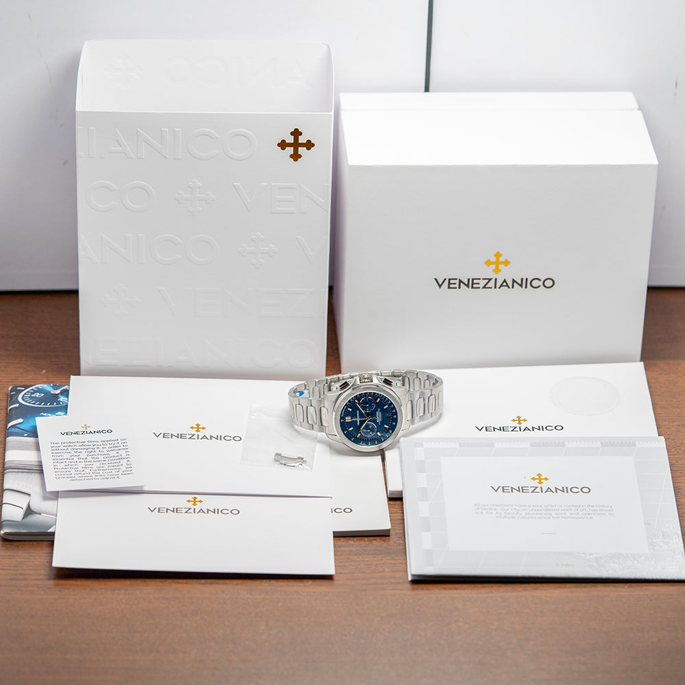 Here, we have a curvaceous, unworn 2023 Venezianico Bucintoro Blue Chrono. Named after the Doge's ceremonial flagship galley that led the Regata Storica, which has taken place on the Grand Canal in Venice since the 13th Century. The polished and brushed 41mm stainless steel case curves over your wrist with thick lugs, and its polished chamfered edge leads to a lug-to-lug length of 47.5mm and a case thickness of 14.5mm, giving the watch an impressive wrist presence. Down the right side, we have the polished pushers for the chronograph and a signed crown, which is protected by crown guards in the centre. The stepped brushed and polished smooth bezel holds a sapphire crystal AR coated above a dynamic sunburst blue bicompax dial. A raised outer Tachymeter rehaut surrounds a minute chapter ring with applied polished facet-edged baton indexes filled with BGW9 Super-LumiNova marking the hours, at 6 o’clock a recessed date window, at 3 o’clock a continuous seconds register and at 9 o’clock a 30-minute register, each sits slightly recessed and has a polished ring and concentric circular pattern, slender steel hands filled with BGW9 Super-LumiNova are complemented by a tapered chronograph hand, at 12 o’clock we have the Venezianico motif and at 6 o'clock “Bucintoro Movimento Automatico Cronografo”. On the reverse, a screwed-down solid case back with the details of the watch in relief around its edge and a splendid engraved depiction of the famous Doge's ceremonial flagship galley, “Bucintoro”. Inside an automatic Seiko Cal. NE86A, 34 jewels, beating at 28,800 beats per hour, this quality column wheel movement has a vertical clutch for precision and has hand winding and hacking seconds for your convenience. It comes paired with its original Venezianico 20mm polished and brushed stainless steel bracelet secured by a signed concealed butterfly clasp; all links are provided. This watch is sold with its original Venezianico box and Venezianico paperwork.